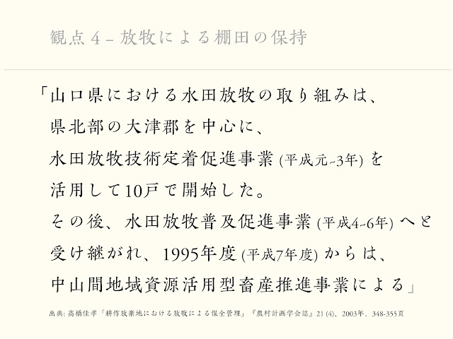 | 出典: 高橋佳孝「耕作放棄地における放牧による保全管理」『農村計画学会誌』21 (4)、2003年、348-355頁 DOI: https://doi.org/10.2750/arp.21.337 |